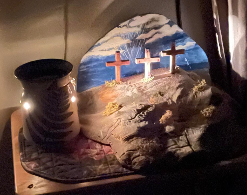 With the help of an artist friend who painted the backdrop, he created the crucifixion scene pictured here. He added the crosses, but had trouble figuring out how to do the blood on Jesus’ cross. God whispered in his ear. Obedient, he grabbed a nail and pierced his own finger. He used his own blood as paint, letting it drip on the four places it was needed. He added the landscaping features and sealant. It looked just like the one in his dream.